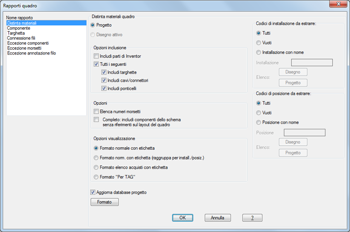 Specifica di includere informazioni su targhette, cavi, connettori e ponticelli nel rapporto. Utilizzare le singole caselle di controllo per includere o escludere una qualsiasi di queste opzioni.