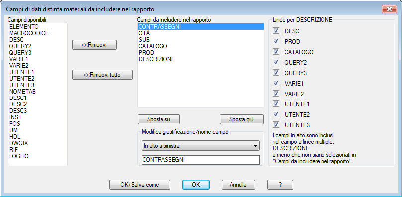 Nota: È inoltre possibile selezionare un campo nell'elenco Campi disponibili per aggiungerlo al rapporto. È possibile riordinare le colonne mediante i pulsanti Sposta su e Sposta giù. Se si fa clic su Ok-Salva come, queste impostazioni verranno salvate in un file per un successivo utilizzo.