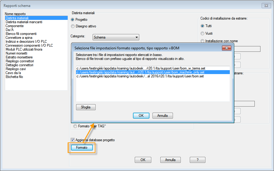 Un file di formato (.set) preformatta i rapporti. Un file di formato è specifico per un tipo di rapporto, ad esempio: il rapporto Distinta materiali o il rapporto Componenti. Un file di formato definisce: