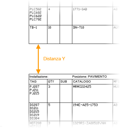 I valori della distanza X e della distanza Y definiscono la distanza tra la fine di una sezione della tabella e l'inizio della successiva. Viene utilizzato quando più sezioni di tabella relative ad un rapporto si trovano nello stesso disegno. La mancata immissione di un valore viene interpretata come zero.