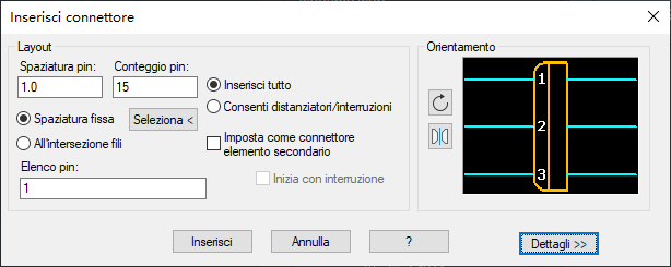 Lo strumento Inserisci connettore crea un simbolo di connettore in base ai parametri definiti dall'utente. Il simbolo viene creato all'istante e inserito come inserimento di blocco nel file di disegno attivo. Dal momento che i simboli vengono creati quando sono necessari, viene meno l'esigenza di creare e gestire una libreria di simboli di connettore.