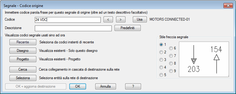 AutoCAD Electrical toolset consente l'utilizzo di una riga di descrizione in una freccia di partenza. Questa descrizione può essere quindi estesa alla freccia di destinazione associata. È possibile definire alcune righe di descrizione per semplificarne l'inserimento senza doverle digitare ogni volta. AutoCAD Electrical toolset ricerca un file denominato WDSRCDST.WDD. Si tratta di un file di testo semplice con ciascuna riga corrispondente ad una descrizione separata. Se questo file è esistente, è disponibile il pulsante Predefiniti nelle finestre di dialogo Segnale - Codice origine e Inserisci codice destinazione.