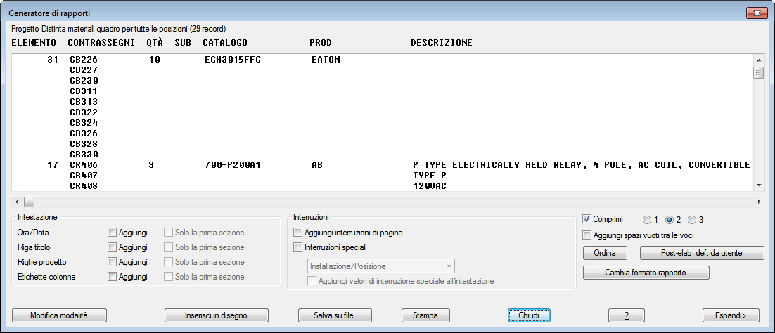Generazione di un rapporto Distinta materiali elettromeccanico