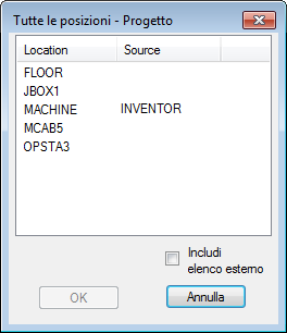 Il pulsante Disegno è disattivato, ma è possibile selezionare un valore dall'elenco Progetto. Gli elenchi di progetti per Installazione e Posizione includono i valori dell'assemblaggio di Inventor. I valori di Inventor sono indicati nella colonna Origine.