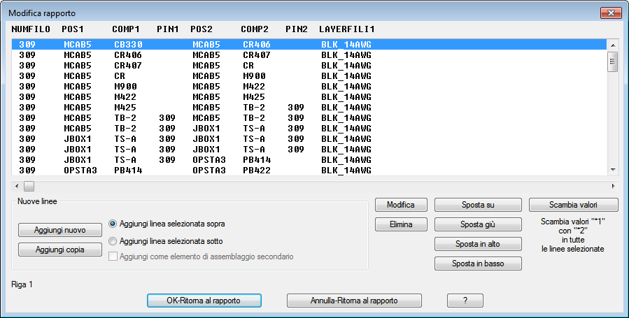 Se il rapporto contiene informazioni relative al cablaggio, ogni voce di riga nel rapporto può includere due componenti connessi, noti anche come componenti Da e A. Le etichette del campo Da terminano con un 1, mentre le etichette del campo A terminano con un 2.