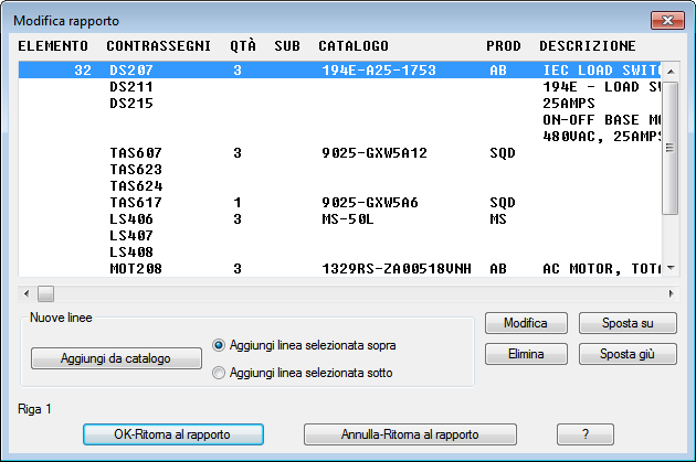 Modificare il rapporto prima di inserirlo nel disegno o salvarlo in un file. È possibile spostare i dati verso l'alto o verso il basso in un rapporto, aggiungere righe da un catalogo ed eliminare righe.