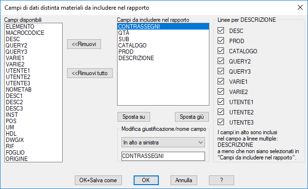 (solo rapporto Distinta materiali) Selezionare i campi da includere nel campo Descrizione multilinea.