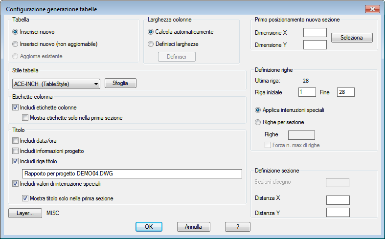 Specificare la distanza X e Y dalla fine di una sezione di tabella all'inizio di quella successiva. Tali valori vengono utilizzati quando esistono più sezioni sullo stesso disegno.