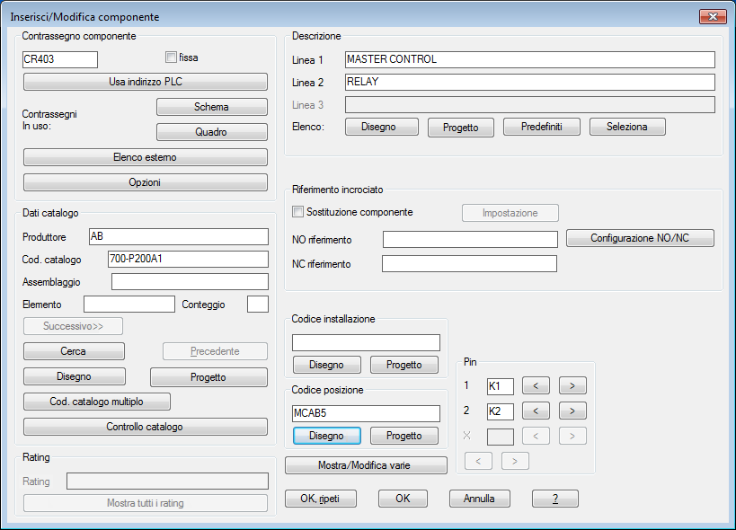 Il codice di catalogo e il codice produttore selezionati vengono visualizzati nella finestra di dialogo Inserisci/Modifica componente. Quando si fa clic su questa finestra di dialogo, i valori vengono trasferiti al simbolo.