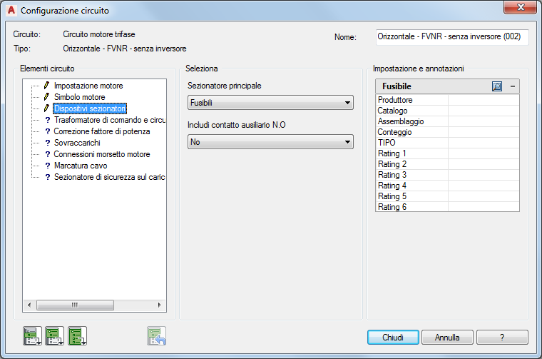 I "blocchi di marcatura" consentono di controllare gli elementi del circuito visualizzati nella finestra di dialogo Configurazione circuito. Ad esempio, un "blocco di marcatura" indica la necessità di un dispositivo sezionatore nel circuito. Nella finestra di dialogo sono disponibili varie opzioni per il dispositivo sezionatore. L'opzione selezionata per questo elemento del circuito viene inserita in corrispondenza della posizione del "blocco di marcatura". Il circuito completo viene generato in modo dinamico in base alle selezioni effettuate in questa finestra di dialogo.