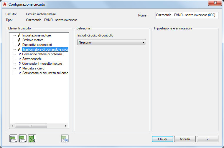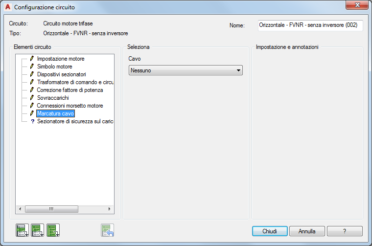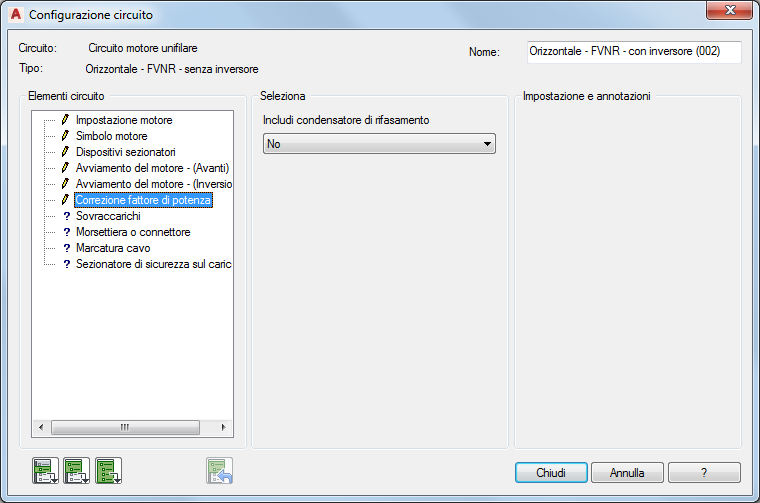 Sezione Impostazione e annotazioni: le opzioni disponibili in questa sezione variano a seconda delle selezioni effettuate nelle sezioni Elementi circuito e Seleziona. Immettere i valori oppure selezionare il pulsante Sfoglia per accedere ad una tabella di ricerca.
