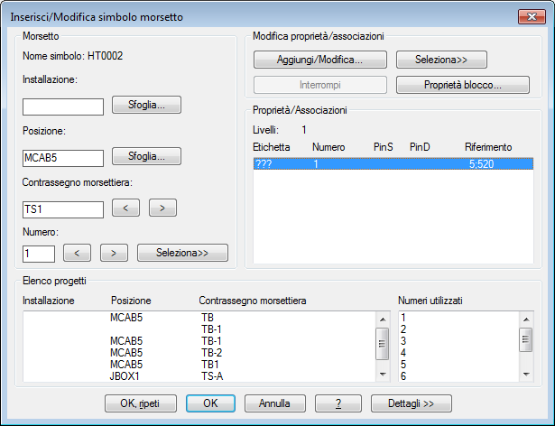 Nella finestra di dialogo Inserisci/Modifica simbolo morsetto, sezione Morsetto, specificare: