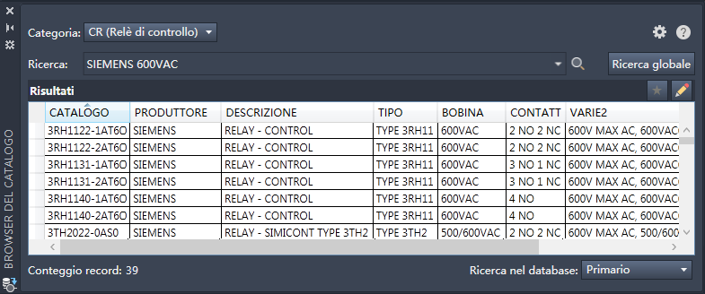Ad esempio, quando si fa clic su Cerca per una bobina di commutazione senza un valore di catalogo, si desidera che il Browser del catalogo cerchi i numeri di parte Siemens per i relè a "600VAC". Modificare il file del database di catalogo, quindi selezionare la tabella _LISTBOX_DEF. Inserire un record con questi valori nei campo: