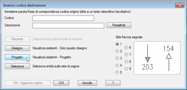 Dopo l'associazione della freccia del segnale di partenza ad un filo del disegno, è possibile associare un segnale di destinazione ad un segmento di filo di una rete di fili. In questo modo il numero di filo assegnato ad un'altra rete di fili di origine passa automaticamente alla rete corrente.