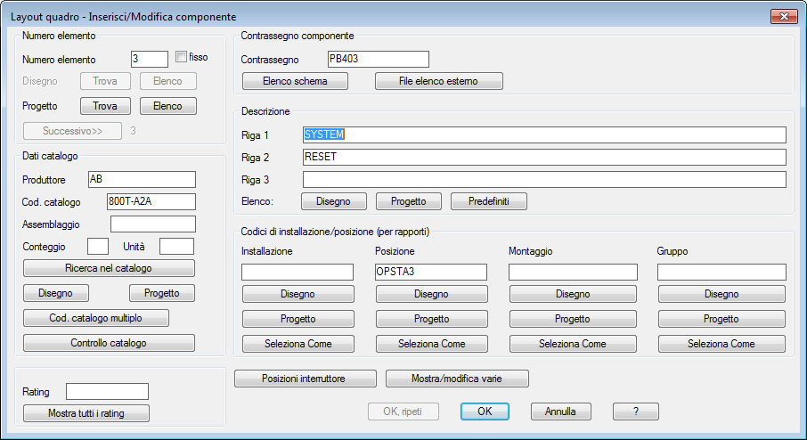 Nota: La finestra di dialogo Layout quadro - Inserisci/Modifica componente viene visualizzata ogni volta che si inserisce un layout del quadro. I dati provenienti dalla rappresentazione dello schema vengono automaticamente riportati nella rappresentazione del layout del quadro.