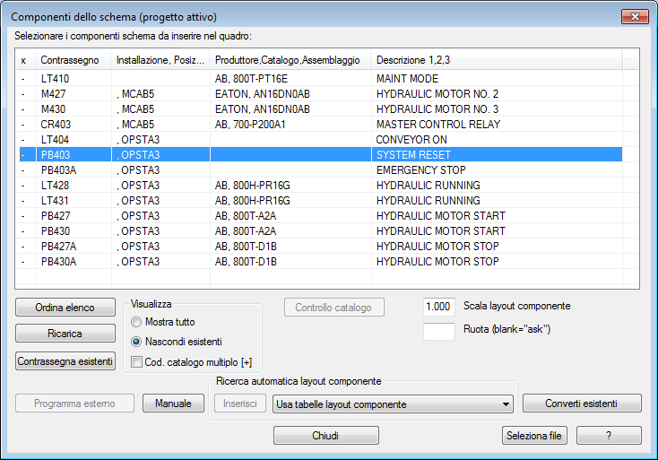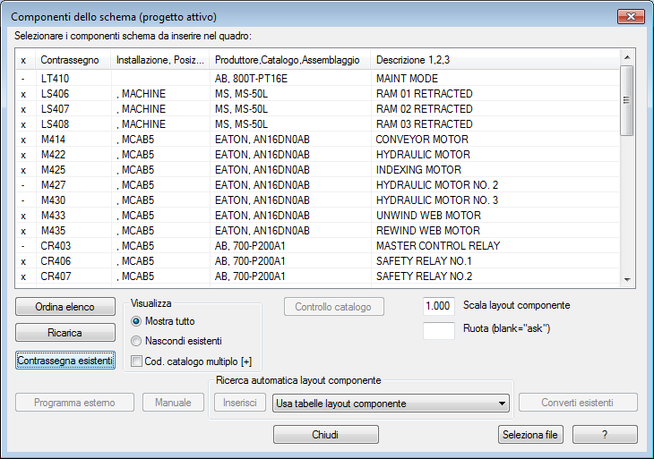 Nella finestra di dialogo Componenti dello schema (progetto attivo), fare clic su Contrassegna esistenti. I layout componente già inseriti nel progetto vengono contrassegnati con una x.