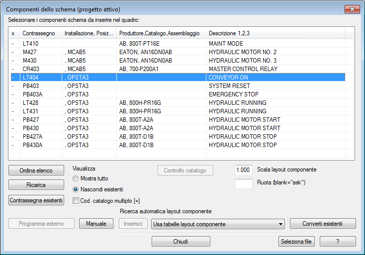 Nella finestra di dialogo Componenti dello schema (progetto attivo), selezionare LT404 OPTSTA3 TRASPORTATORE ATTIVO
