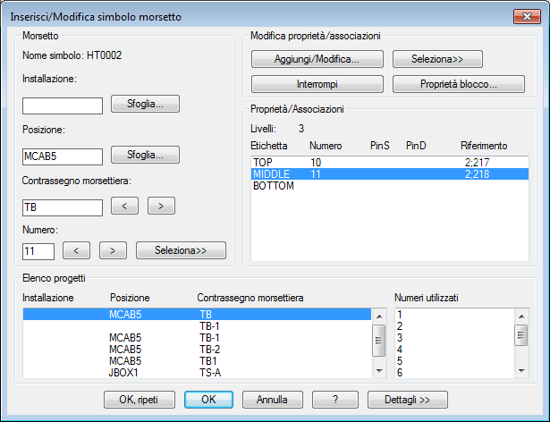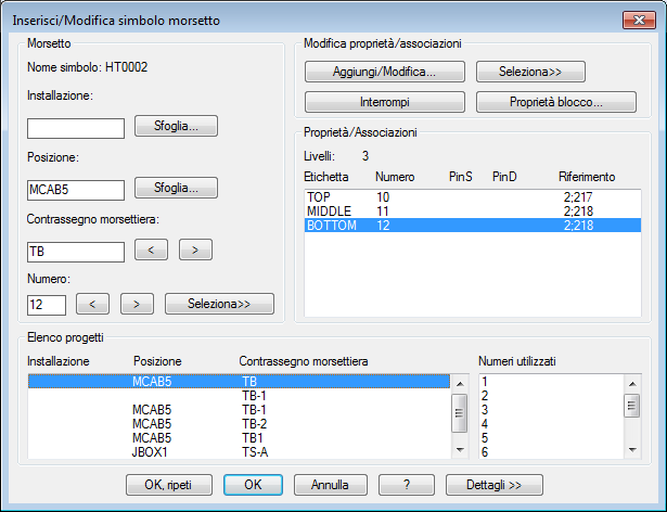 Le assegnazioni di livello vengono visualizzate nella sezione Proprietà/Associazioni della finestra di dialogo Inserisci/Modifica simbolo morsetto. I livelli 1, 2 e 3 risultano ora assegnati.