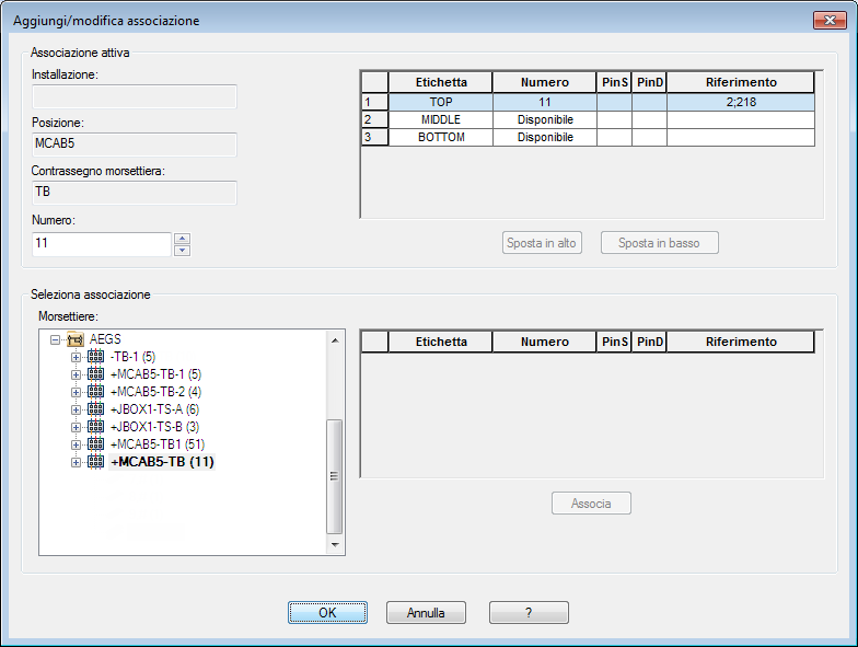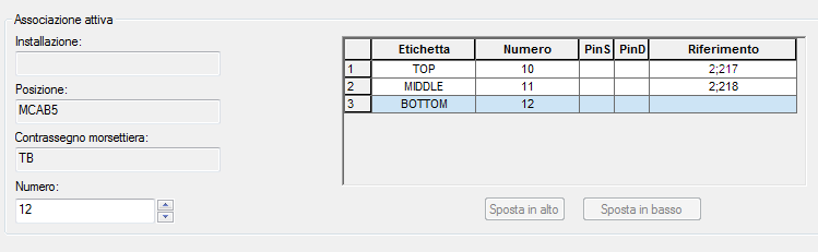 Dopo aver fatto clic su Associa, il livello inferiore viene aggiornato con il numero di morsetto riportato nella griglia della sezione Associazione attiva della finestra di dialogo. È possibile modificare la disposizione dei livelli selezionando un livello e facendo clic su Sposta in alto o Sposta in basso.
