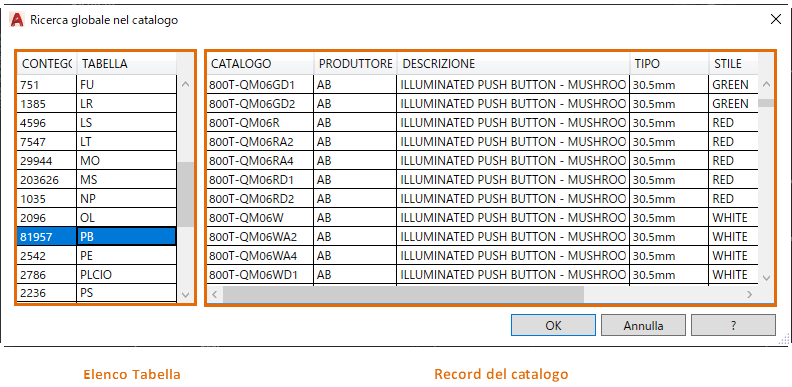 - Visualizza i record del catalogo nella tabella selezionata che corrispondono al valore di ricerca. Fare clic su un'intestazione di colonna per ordinare i record in base ai valori in essa contenuti.