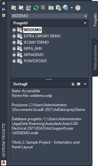 AutoCAD Electrical toolset è un sistema basato su progetti. Un testo ASCII con estensione .wdp definisce ciascun progetto. Questo file contiene un elenco di informazioni sul progetto, impostazioni di default del progetto, proprietà dei disegni e nomi dei file di disegno. È possibile disporre di un numero illimitato di progetti ma può essere attivo un solo progetto alla volta.