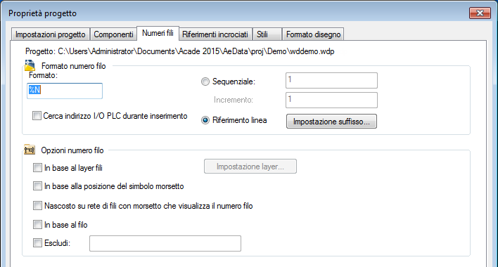 Verranno così creati contrassegni di numeri di fili basati su riferimenti univoci per più reti di fili che iniziano sulla stessa posizione di riferimento. Quando si utilizza il metodo di numerazione basato sui riferimenti, è necessario un suffisso variabile per fare in modo che i fili che si trovano sulla stessa linea o zona di riferimento restino univoci. Fare clic su Impostazione suffisso per modificare tale suffisso.