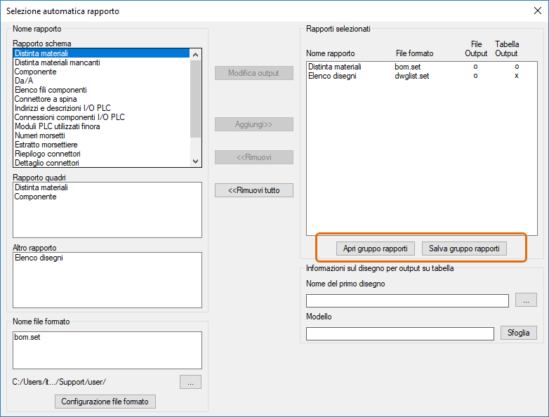 Se si esegue frequentemente lo stesso gruppo di rapporti, è possibile salvare il gruppo come gruppo di rapporti. Per impostare un gruppo di rapporti, aggiungere tutti i file di formato come per eseguire i rapporti e salvare gruppo rapporti. Le informazioni sui file di formato vengono salvate in un file di gruppo di rapporti, con estensione .rgf. La volta successiva che si desidera eseguire il gruppo di rapporti, aprire il file .rfg salvato in precedenza.