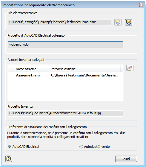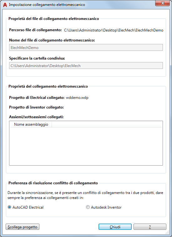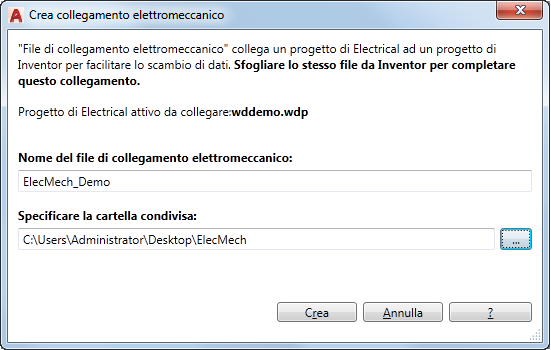 Creare un file di collegamento elettromeccanico che colleghi un progetto di AutoCAD Electrical toolset a un progetto di Inventor.
