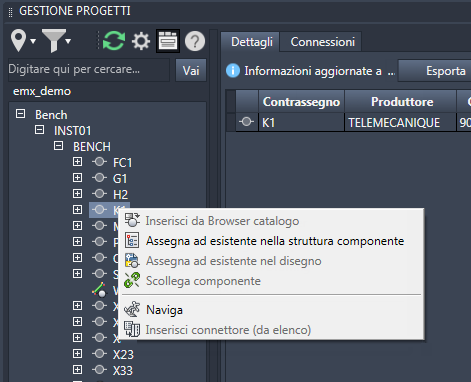 Spostarsi dalla rappresentazione del componente nella vista della struttura del componente o dal riquadro Dettagli e connessioni ad un simbolo nel disegno.