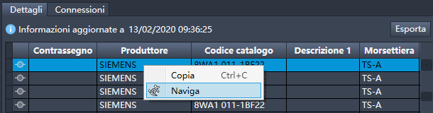 Per navigare su un numero di filo, fare clic su Visualizza dettagli e connessioni , quindi sulla scheda Connessioni. Selezionare una riga o un gruppo di righe, fare clic con il pulsante destro del mouse e selezionare Naviga.