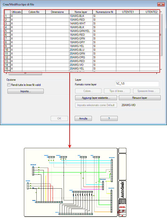 Utilizzare lo strumento Crea/Modifica tipo di filo per creare nuovi tipi di filo o modificare tipi di filo esistenti oppure lo strumento Cambia/Converti tipo di filo per convertire le linee in fili. Il nome del layer di fili e le proprietà dei fili associate, quali il colore, le dimensioni e l'eventuale elaborazione del layer di fili per i numeri dei fili, vengono salvati nel file di disegno. Di seguito sono riportate le regole che determinano il layer di fili per un nuovo filo: