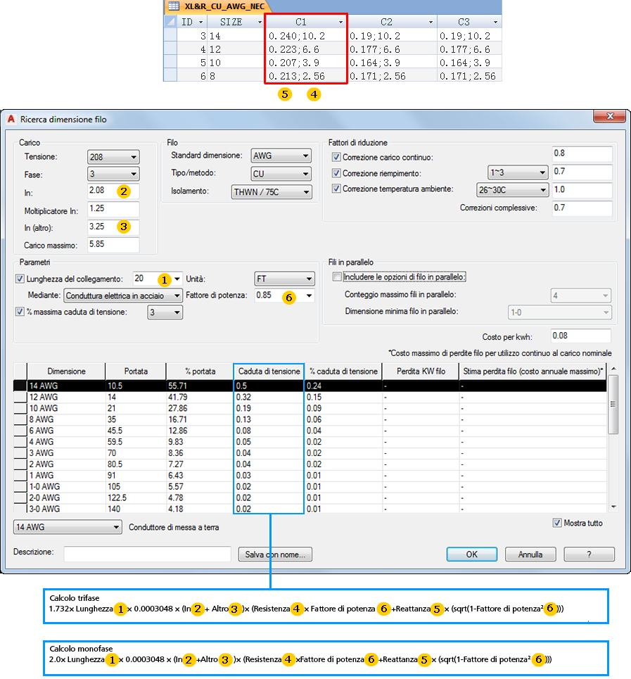 Dimensioni del filo estratte dalla tabella delle portate del filo nel database degli standard elettrici. |