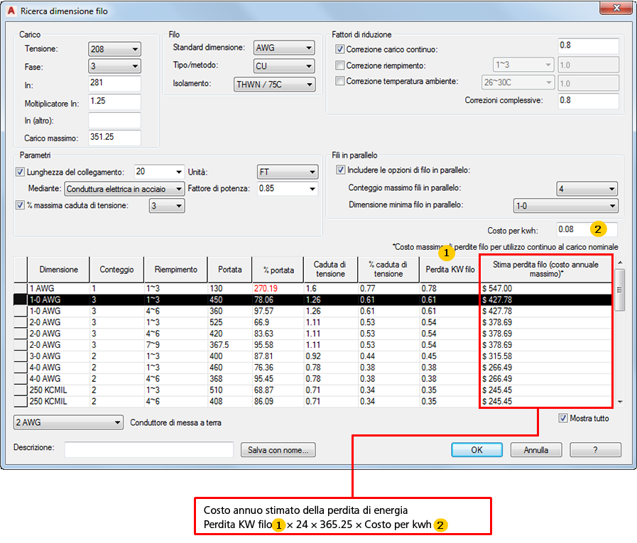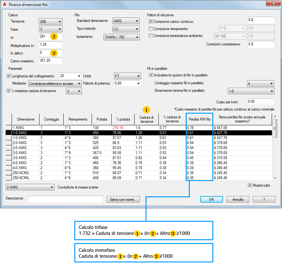 Specificare i parametri del filo e selezionare una dimensione dall'elenco di dimensioni del filo che soddisfano o superano i parametri. Le perdite di energia stimate per dimensione del filo possono fornire informazioni preziose in questa selezione.