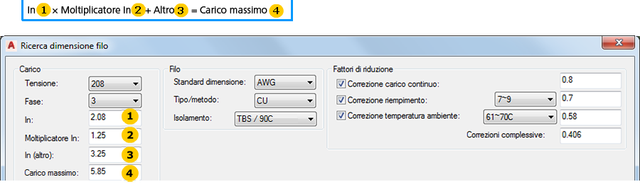 Visualizza il carico massimo calcolato per i conduttori. Si basa sul valore In (Altro) aggiunto al prodotto della moltiplicazione del valore In per il numero di moltiplicatori In. |