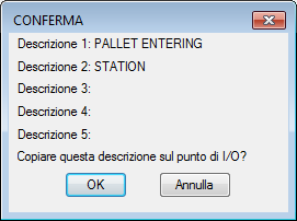 In questa finestra di dialogo è possibile inserire un testo descrittivo per ciascun punto di I/O. Si supponga che le descrizioni già assegnate agli interruttori di fine corsa connessi siano simili al testo che si desidera utilizzare per le descrizioni dei punti I/O PLC.