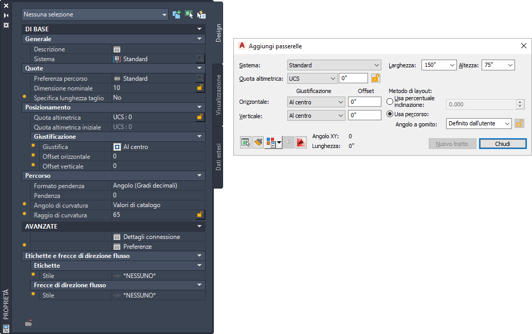 2. Per i passaggi successivi, utilizzare il riquadro proprietà per le impostazioni dei tubi protettivi o la finestra di dialogo Aggiungi passerelle per le impostazioni delle passerelle, come indicato di seguito.