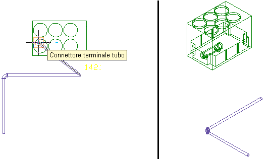 Nel seguente esempio viene illustrato il funzionamento delle soluzioni di percorso durante la connessione di una tubatura ad un refrigeratore. La tubazione si trova su una quota diversa e la sua estremità non è allineata con la connessione del refrigeratore. Selezionare l'ultimo segmento di tubo, quindi fare clic su