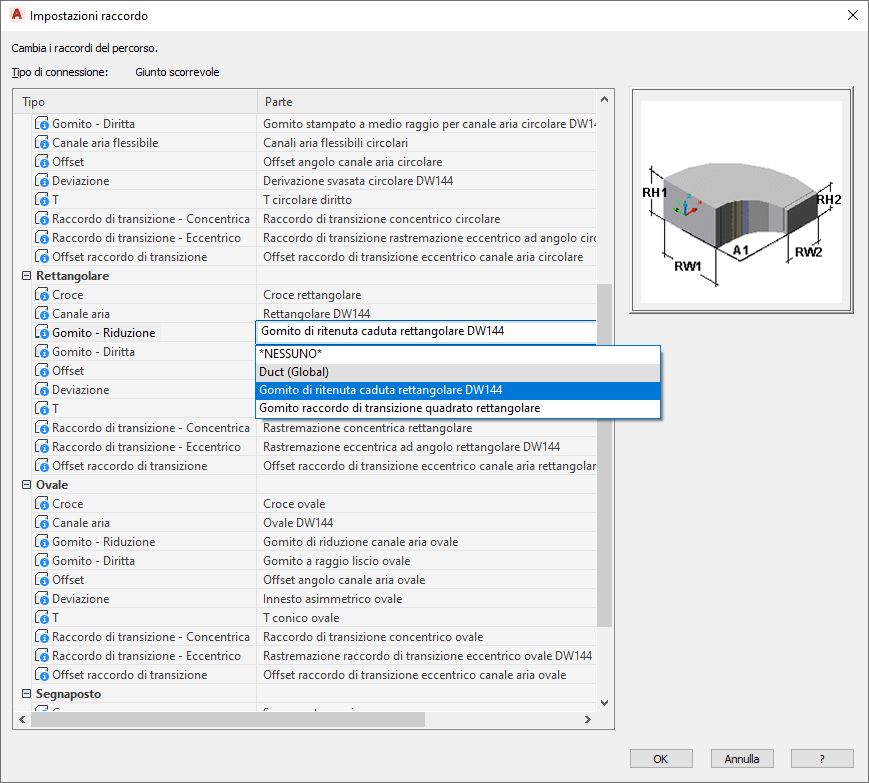 Quando si configura una preferenza di percorso per una determinata specifica, i raccordi appropriati vengono inseriti automaticamente nel layout del canale aria.