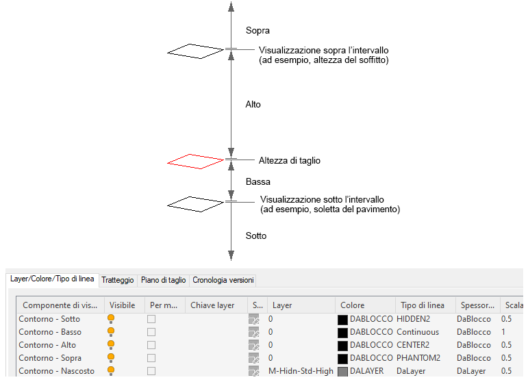 I valori immessi per gli intervalli Sopra e Sotto non sono relativi all'altezza di taglio. Sono valori di altezza assoluti calcolati dall'origine WCS. Pertanto, il valore che si immette per Visualizza sopra intervallo deve essere superiore al valore immesso per Altezza di taglio. Valori non validi causeranno risultati non corretti.