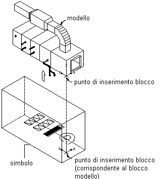 Per assicurare il corretto controllo della visualizzazione del simbolo quando questo viene aggiunto ai disegni, disegnare la geometria per il simbolo sul layer 0, assegnare DABLOCCO per colore e tipo di linea e DALAYER per lo spessore linea. Il punto di inserimento o punto base viene utilizzato come riferimento per il posizionamento di blocchi al momento dell'inserimento. Il punto di inserimento del blocco schematico deve essere identico a quello del blocco modello 3D che rappresenta. Quando si posiziona la parte multivista in un disegno, tutti i blocchi associati fanno parte di un unico oggetto, pertanto è preferibile mantenere un punto di inserimento comune.