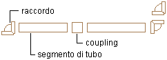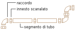 ![]() Da raccordo a tubo: si suppone che raccordi e segmenti di tubo abbiano estremità scanalate predisposte per ricevere un innesto. Per connettere il raccordo al tubo viene aggiunto un innesto. Da tubo a tubo: per connettere i segmenti di tubo viene aggiunto un innesto. Da raccordo a raccordo: per connettere i raccordi viene aggiunto un innesto. |