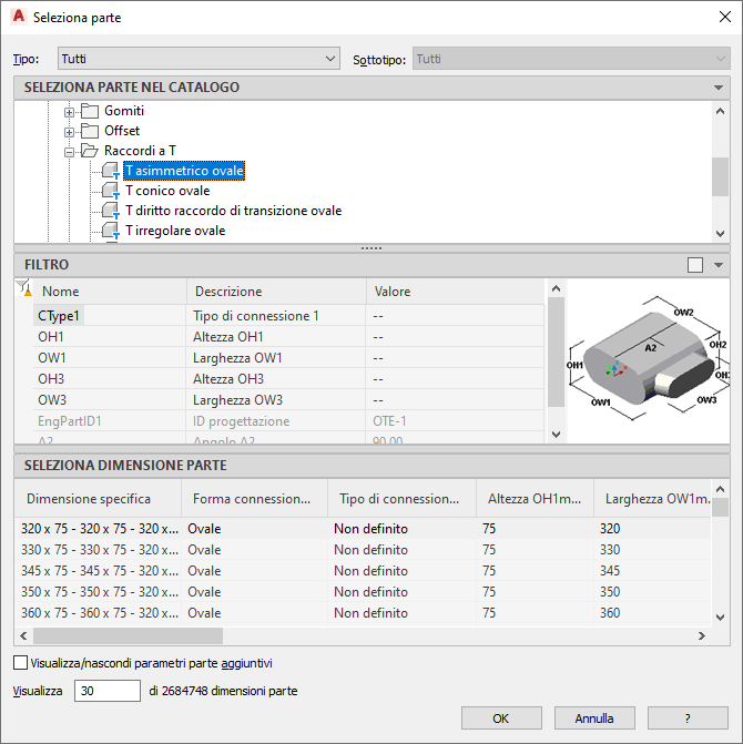 In Seleziona parte nel catalogo, la finestra di dialogo organizza i raccordi del canale aria in base al tipo di forma.