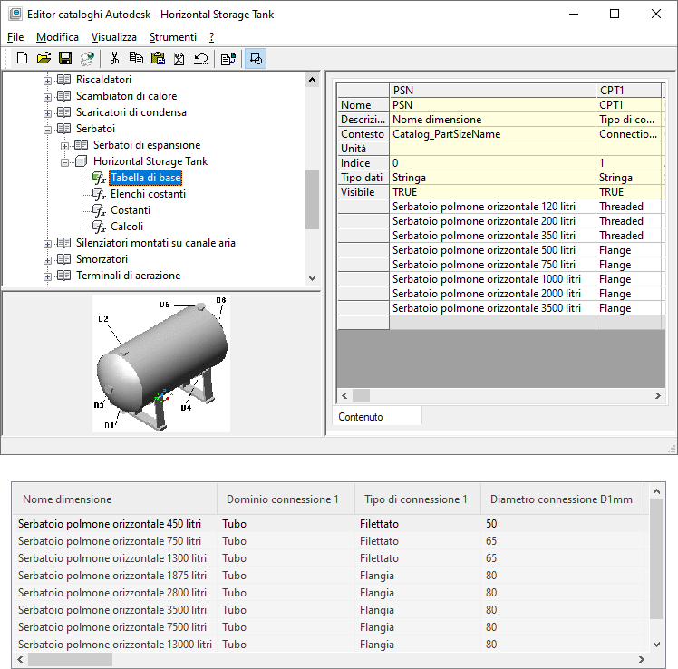I parametri comuni restano costanti per tutte le dimensioni parte; vengono definiti una volta in una famiglia di parti e condivisi da tutte le dimensioni parte. Se si modifica un parametro comune, questo viene aggiornato per tutte le dimensioni parte. Domini, tipi e sottotipi fanno parte dei parametri comuni. Di seguito sono illustrati esempi di parametri comuni per dimensioni parte meccaniche, elettriche e idrauliche.
