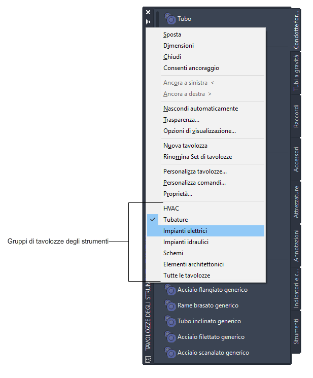 Nel menu di scelta rapida selezionare il gruppo di tavolozze degli strumenti da visualizzare.