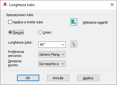 | Spezzare un segmento | Selezionare Spezza e immettere un valore in Lunghezza tubo. È inoltre possibile fare clic su |