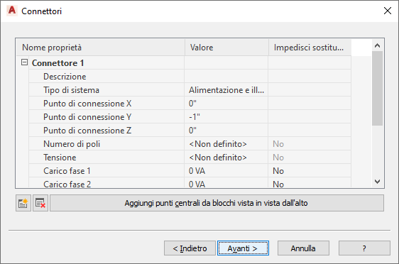 | Specificare un tipo di circuito per il connettore | Selezionare un tipo di sistema in Tipo di sistema. Nota: Se si seleziona Alimentazione e illuminazione, è possibile configurare proprietà del connettore aggiuntive quali la tensione e il carico.