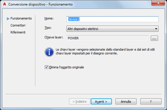 Se si utilizzano le impostazioni specificate nonché il blocco AutoCAD o il blocco vista correntemente assegnati al blocco o alla parte multivista, vengono creati uno stile di dispositivo e un nuovo dispositivo. Tuttavia lo stile di dispositivo contiene impostazioni aggiuntive che è possibile configurare. Ad esempio, è possibile selezionare un metodo di posizionamento del filo diverso da quello di default; è inoltre possibile modificare le definizioni vista di default.