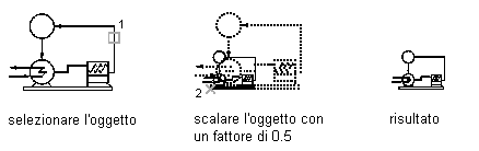 Di seguito, a scopo esemplificativo, è indicata la procedura per ridurre le dimensioni di un simbolo schematico della metà, adottando un fattore di scala pari a 0,5. I numeri in parentesi sono riferiti alle illustrazioni riportate dopo la procedura.