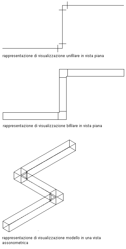 Alla maggior parte di oggetti di AutoCAD MEP 2027 toolset sono associate le rappresentazioni di visualizzazione Unifilare, Bifilare, Modello e Piano, poiché si tratta delle situazioni di design più comuni che richiedono viste diverse di un sistema dell'edificio.