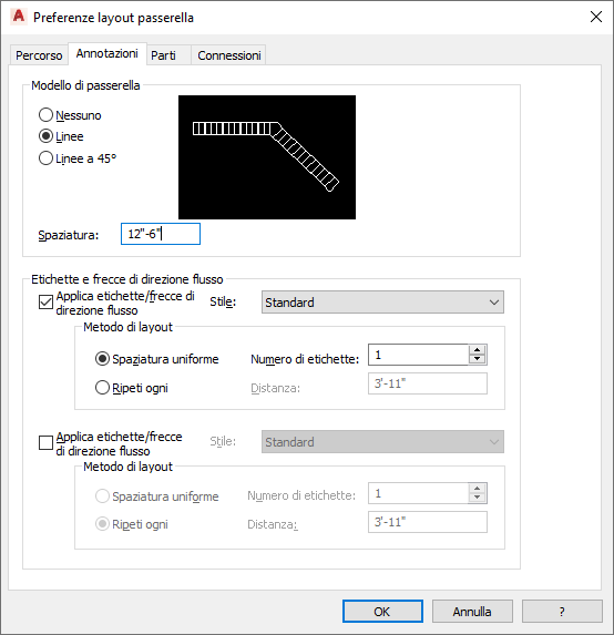Quando si disegnano tratti di passerelle, è possibile aggiungere agli stessi etichette o frecce di direzione del flusso. È inoltre possibile specificare il modello di tratteggio da applicare, nonché impostare linee verticali o a 45 gradi e la spaziatura tra le linee desiderata.